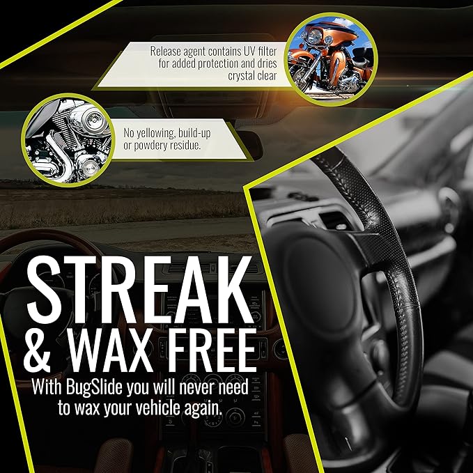 - Streak and Wax-Free – With BugSlide you will never need to wax your car again. Applied and paired best with a microfiber cloth towel to wipe clean, the release agent contains a UV filter for added protection and dries crystal clear with no yellow tint, film, build-up or powdery residue.