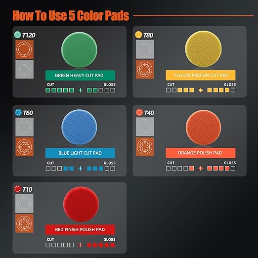 - [T40 Orange Medium-Cut Polishing Pad]: T40 Orange Medium-Cut Foam Pad is Light Cutting Pad, It's Can Remove 2000# Sanding Disc Marks, Fine Scratches & Light Oxidation, It's Can Work With SPTA Medium Cut Polishing Compound ,Ideal For Rotary And DA Car Polisher.