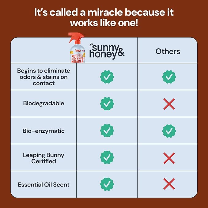 - Pet Cleanup Champ: Sunny & Honey's enzyme cleaner is your go-to for tackling pet messes head-on, from dog pee to cat accidents. This pet carpet cleaner makes freshening up your space super easy, no matter what your furry friend leaves behind