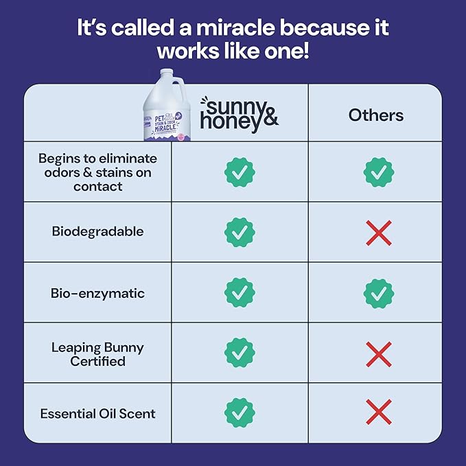 - Pet Stain Magic: Say goodbye to pet messes with Sunny & Honey's Pet Stain & Scent Miracle. Our pet enzyme cleaner lavender scent tackles everything from cat pee to dog accidents without harsh odors
