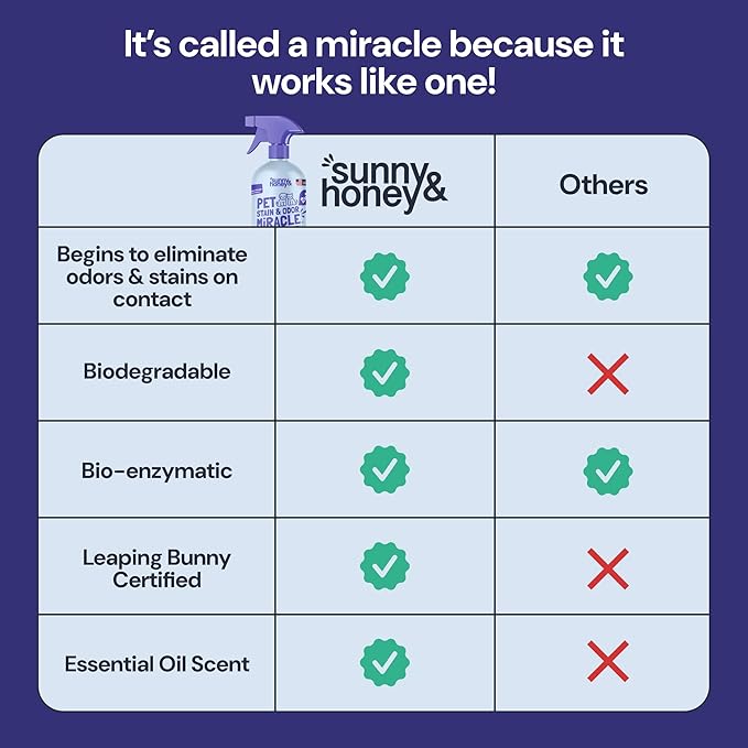 - Pet Stain Power: Sunny & Honey Pet Stain Miracle is your go-to for fast relief from pet messes using natural enzymes for a deep clean. Whether it's a couch cleaner or a pet stain remover for carpet, it handles accidents like a boss