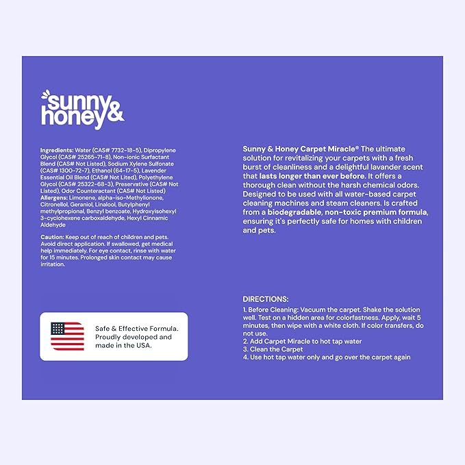 - Sunny & Honey Power: Dive into the holidays with Sunny & Honey Carpet Miracle, the supreme guest-ready carpet cleaner. Whether it's pet mishaps or post-party messes, this pet carpet cleaner solution has your back, making clean-ups a breeze