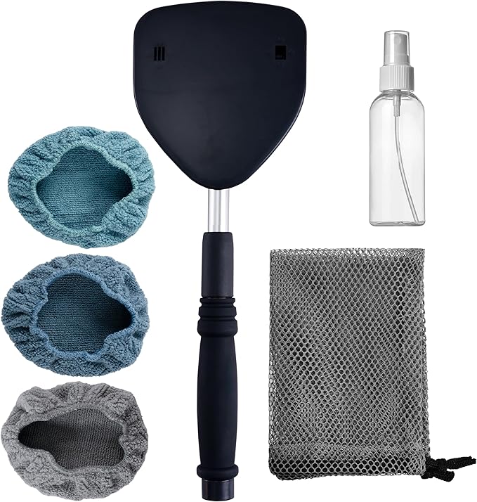 Polyte Pivoting Windshield Glass Cleaning Tool Extendable Aluminum Handle w/3 Premium Microfiber Covers, Spray Bottle, Mesh Bag, Triangle Shaped Plate