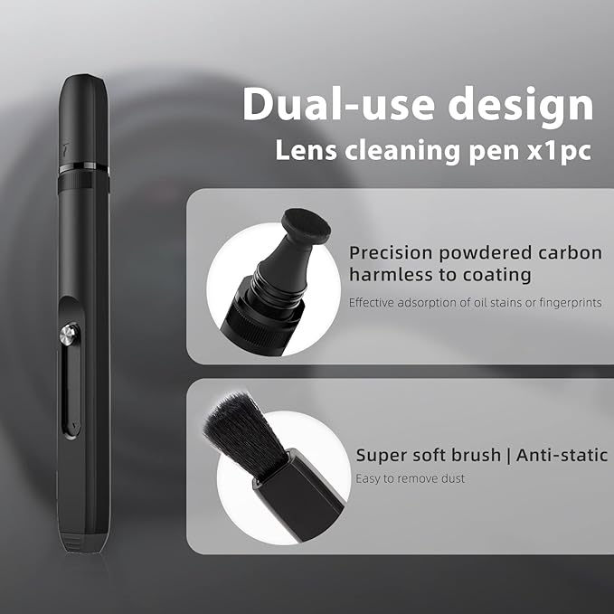 - [Advanced Lens Cleaning Pen] Features a soft retractable brush and multilayer nanoscale carbon tip. Effectively removes fingerprints, smudges, and oil stains from lenses, screens, viewfinders, and optical surfaces without scratching.