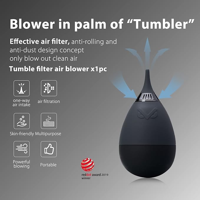 - [Award-Winning Air Blower] The tumbler-style air blower with one-way air inlet and built-in filter prevents secondary pollution. Stable base design keeps the nozzle off the ground. Winner of the 2019 Red Dot Design Award.