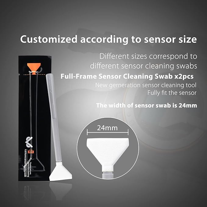 - [Dual Sensor Cleaning Swabs] Includes 24mm swabs for full-frame and 16mm swabs for APS-C sensors. Designed to safely and effectively remove dust and debris from sensitive CMOS or CCD sensors.