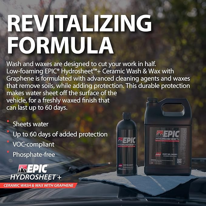 - ONE STEP TO CLEAN, SHINE, PROTECT: The Epic Hydrosheet is a low foaming, VOC compliant, and phosphate free formula that utilizes advanced technology to clean, shine, and protect your vehicle in just one easy step.