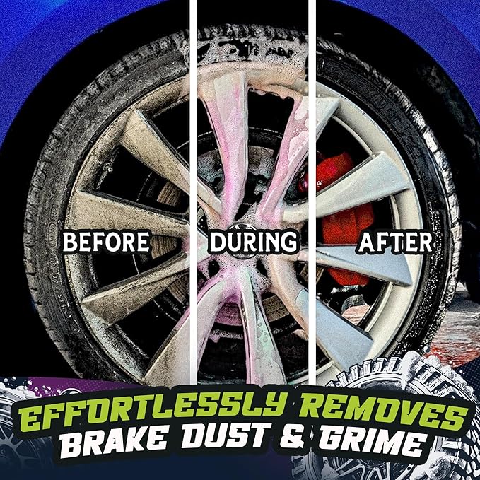 - POWERFUL DEEP CLEANING: This high-performance wheel cleaner breaks down stubborn brake dust, dirt, and road grime on contact. Its advanced formula lifts contaminants effortlessly, restoring a spotless, like-new shine with minimal scrubbing.