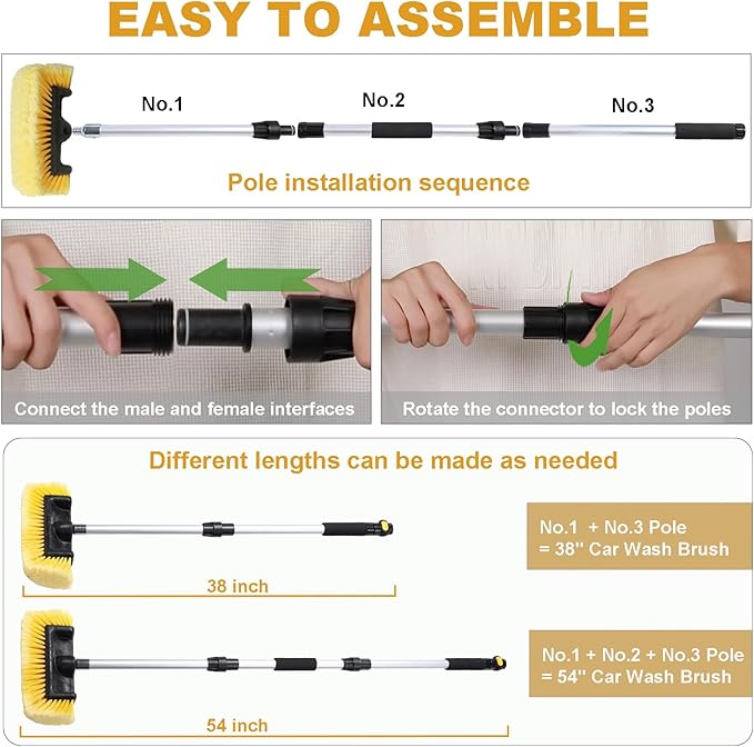 - 【 Versatile Car Wash Supplies 】The assembled car wash brush with long handle reaches a total length of 54“, offering unmatched flexibility and comfort for cleaning hard-to-access areas. Perfect for cleaning or washing Solar Panels, House Siding, Auto Cars, Trucks, SUV, RV, Camper, Boats, Decks, Floors, Patios, Bathrooms, Showers, Snow Removal and more!
