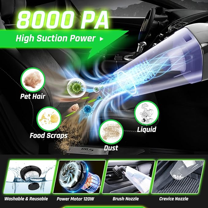 - 8000 PA POWERFUL CAR VACUUM- This car cleaning interior detailing kit come with powerful car vacuum, which Equipped with a 120W/12V powerful motor, the portable car vacuum cleaner provides strong suction power of up to 8000pa. It can easily clean to terminate any dirt, pet hair or debris. The power cord is 15 feet long makes it easy to clean every nook and cranny in your car's back seat and trunk. And car vacuum attachments - auxiliary connector, brush nozzle and spare HEPA filter.