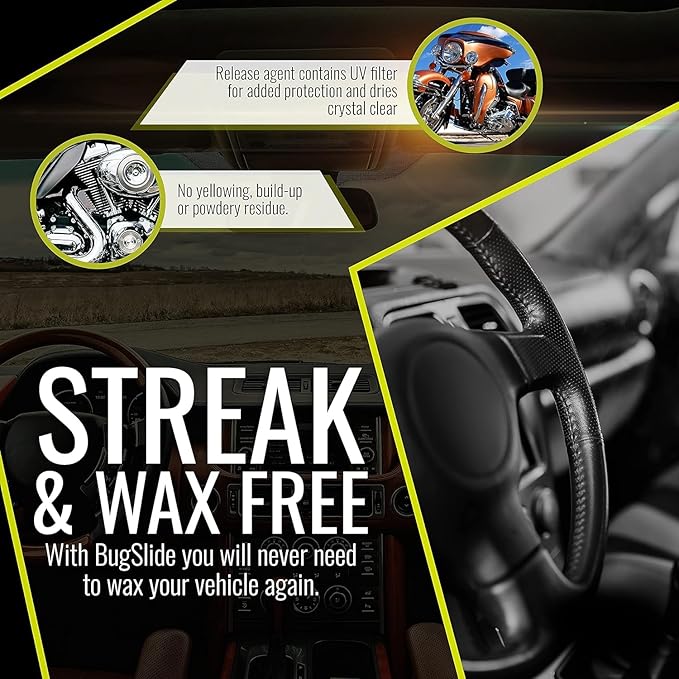- Streak and Wax-Free β With BugSlide you will never need to wax your car again. Applied and paired best with a microfiber cloth towel to wipe clean, the release agent contains a UV filter for added protection and dries crystal clear with no yellow tint, film, build-up or powdery residue.