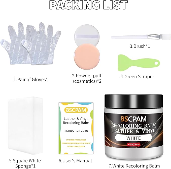 - Easy DIY Repairs: Leather repair kit includes, 1 Recoloring Balm + 1 Sponges + 2 Gloves + 2 Powder Puff + 1 Brush + 1 Putty Knife + User's Manual,meet any leather repair project