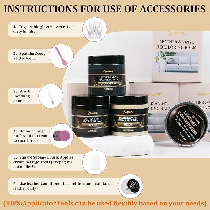 - 【Satisfaction with Leather Repair Kit】 SIHOOPE leather repair kit for furniture includes, 1 Leather Balm +leather conditioner+ 1 Sponge + 2 Gloves + 2 Powder Puff + 1 Brush + 1 Putty Knife + User's Manual,offers a convenient and cost-effective solution for your leather repair needs.If unsatisfied with results, please contact us. We look forward to providing you with an excellent shopping experience