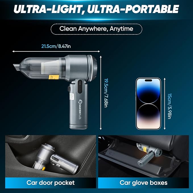 - Ultra-Light, Ultra-Portable – Clean Anywhere, Anytime:Only 0.99 lbs, as light as your excuses to skip cleaning.At 21.1*19.5*6.8cm, SakerPlus mini vacuum cleaner cordless slips into car doors, backpacks, glove boxes—you name it.No cords. No bulk. Just grab and go.Whether it’s pet hair on the floor or cookie chaos in your seat crack, you’re armed.