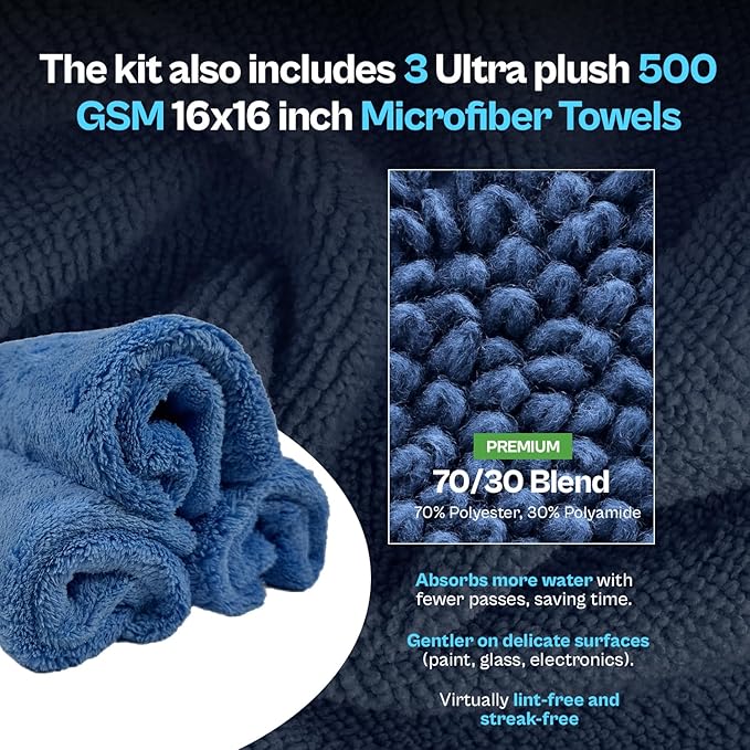 - TOWELS INCLUDED: Kit includes three ultra plush 500 GSM 16x16 inch microfiber towels. Made with a premium 70/30 blend for a scratch free experience.