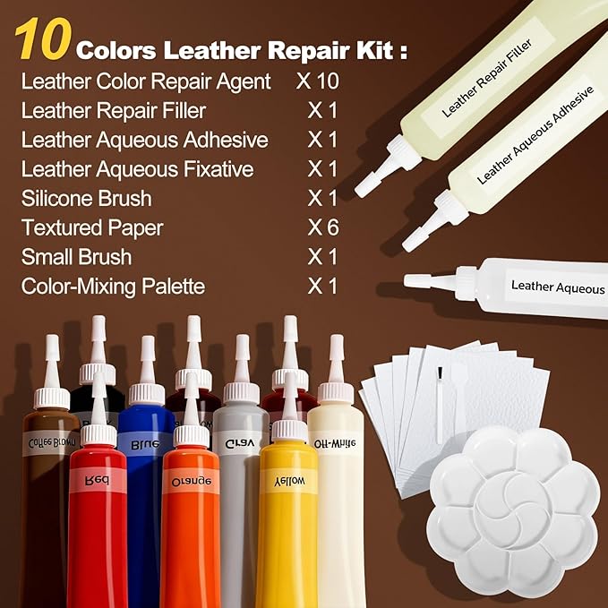 - Complete Leather Repair kit: Includes 10 color repair compounds and 3 essential agents: Leather Filler, Water-based Sealer, and Adhesive. The kit comes fully equipped with 6 grain papers, a mixing palette, a silicone spatula, and a detail brush - everything you need to achieve professional-grade restoration results at home