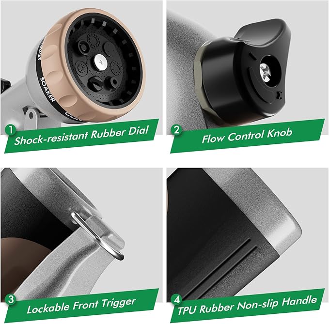 - HEAVY-DUTY GARDEN HOSE NOZZLE: Body and trigger are constructed with 100% powder-coated metal material, which is robust to resist rust, corrosion and wear. The shock resistant rubberized bezel dial can also prevent it from accidental drops and damage. It is much stronger, more durable and long-lasting than plastic water nozzles.